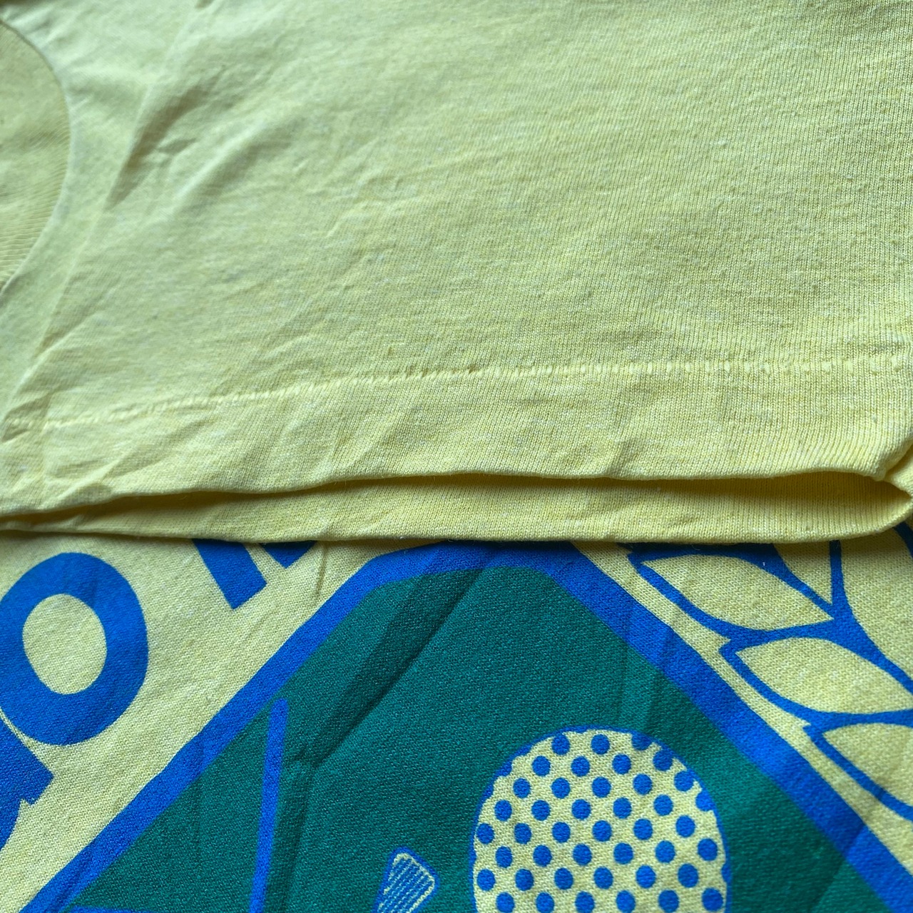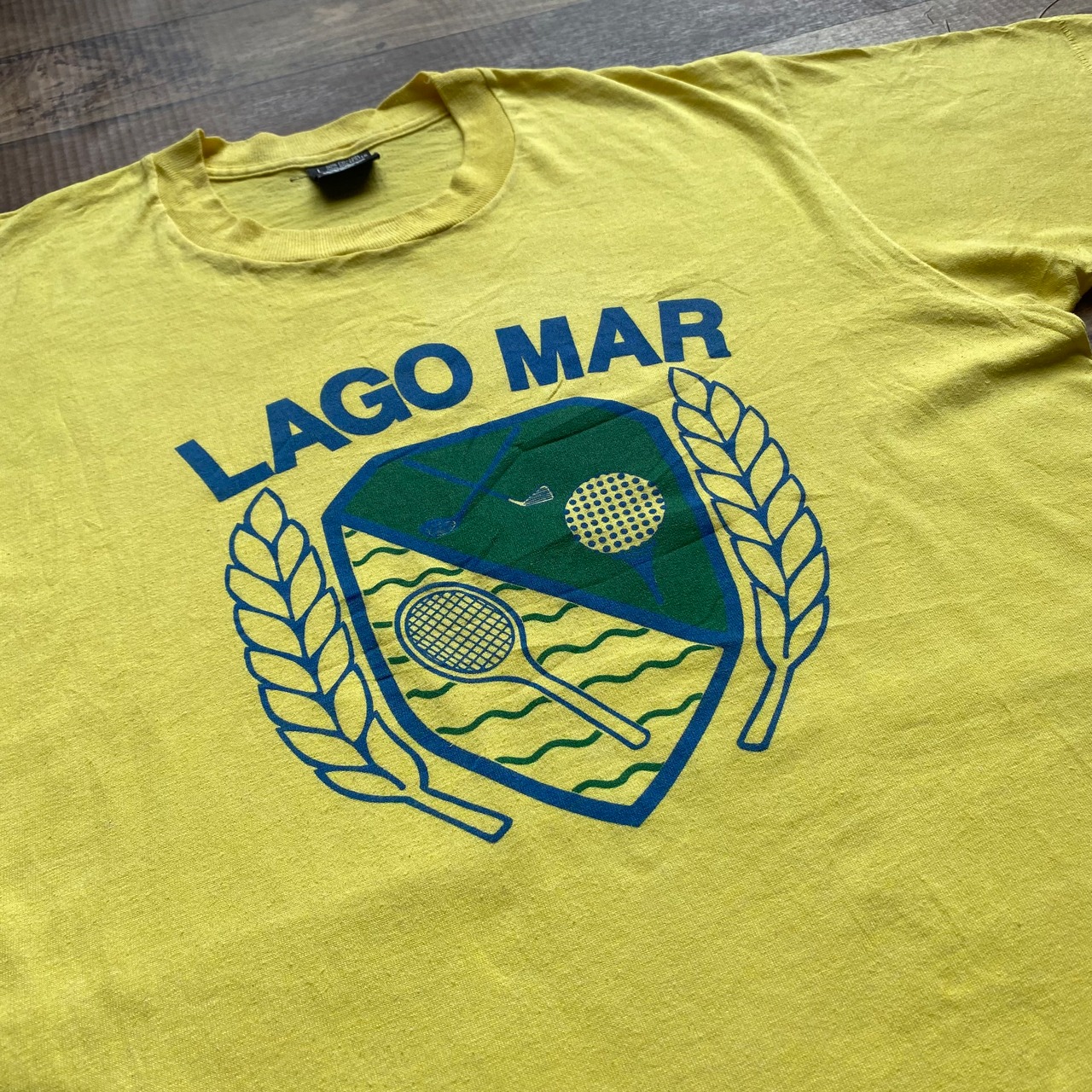 LAGO MARのクラブロゴが映えるヴィンテージTシャツ。テニス、ゴルフ、波をモチーフにしたスポーツテイストのデザインが特徴的。柔らかな50/50ボディは「SCREEN STARS BEST」製で、80年代アメリカ製ならではの風合いと発色を楽しめます。
