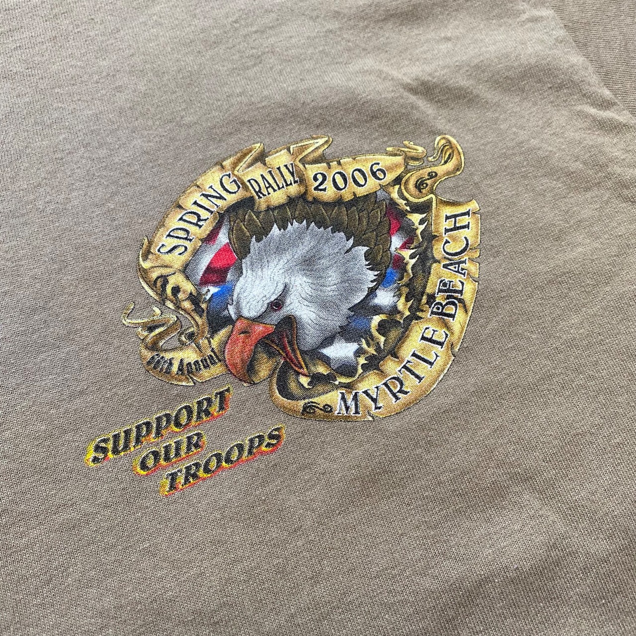 2006年のマートルビーチ・スプリングラリーを記念したプリントTシャツ。フロント・バック共にバald eagleと「SUPPORT OUR TROOPS」の力強いグラフィックが特徴です。ややフェードしたサンドカラーで、アメカジ・バイカースタイルに相性抜群です。