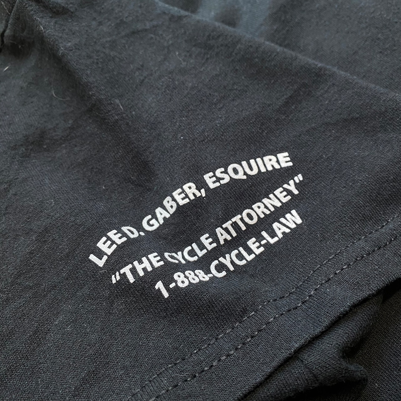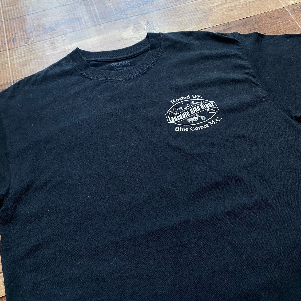 バイカーイベント「Lansdale Bike Night」のTシャツ。フロントにシンプルなイベントロゴ、バックにはインパクトのある”King Daddy Fire Up Main Street”グラフィックがプリントされた一枚。GILDANのDryBlendボディでドライな着心地。袖にはスポンサーである弁護士事務所のプリントもあり、当時のローカルイベントらしい雰囲気が魅力です。
