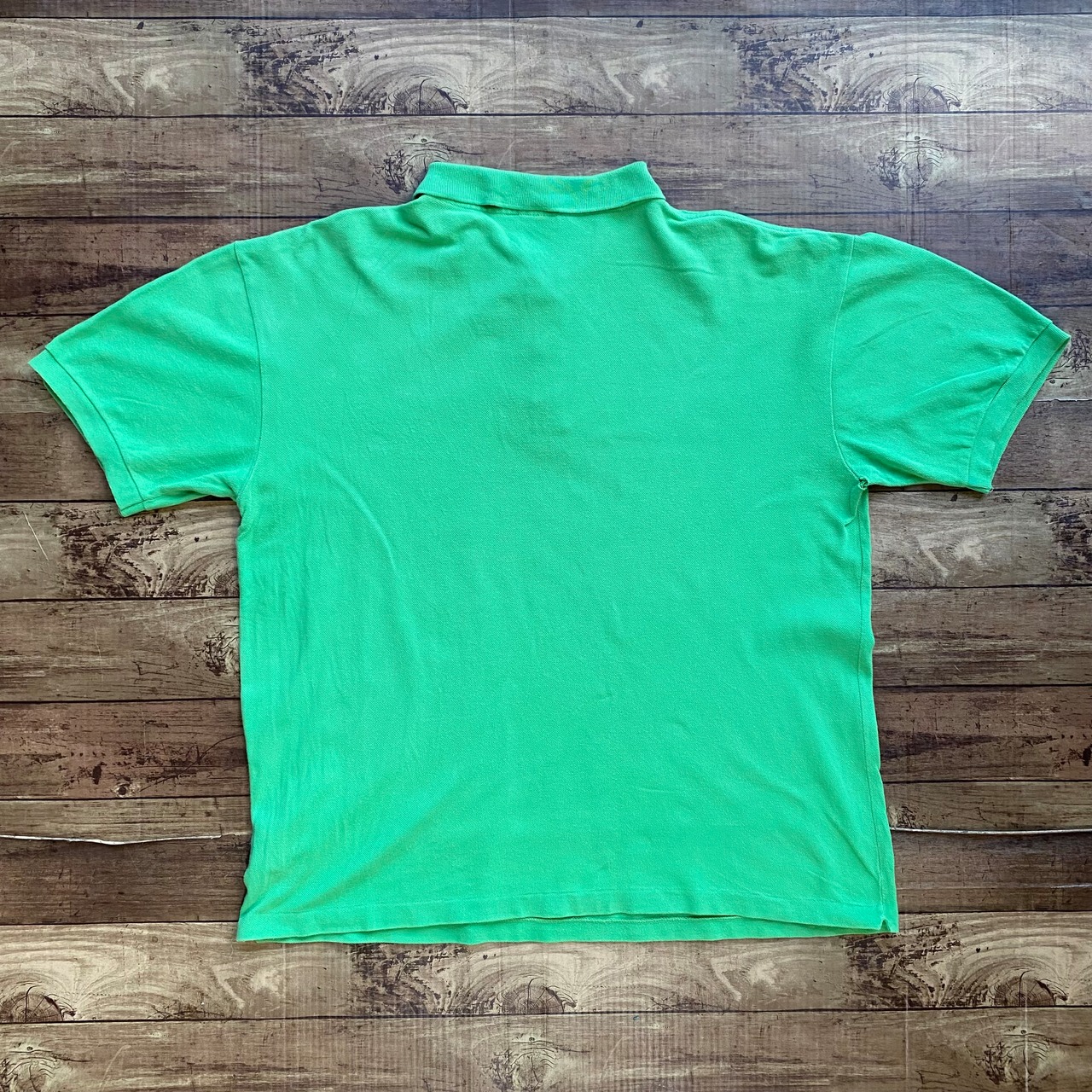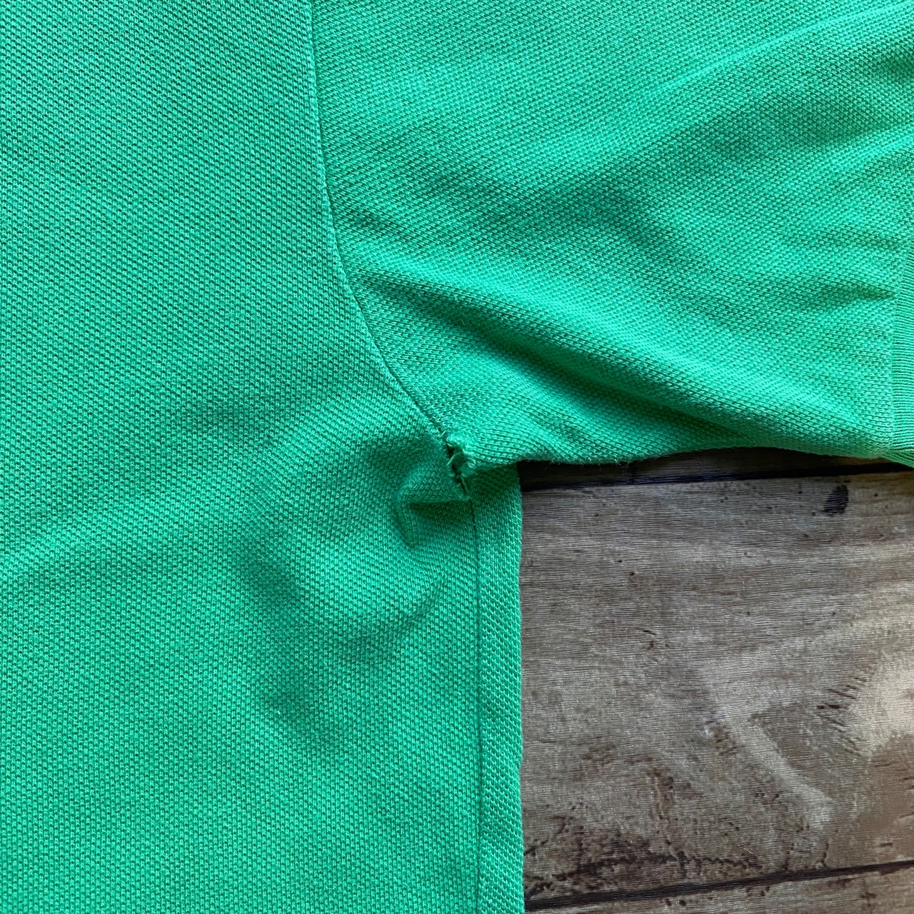 90年代ラコステのポロシャツです。鮮やかなグリーンカラーがコーディネートのアクセントになります。ペルー製。柔らかな鹿の子素材で通気性も良く、カジュアルからきれいめまで幅広く着用できます。脇部分に裂けがありますが、縫製で補修可能です。