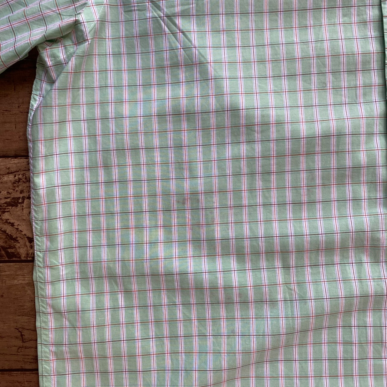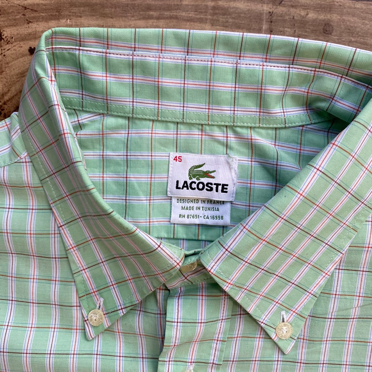 90年代ラコステのチェック柄半袖シャツです。爽やかなグリーンベースに赤と白のラインが映える配色。ボタンダウン仕様でカジュアルにもきれいめにも合わせやすい一枚です。チュニジア製。