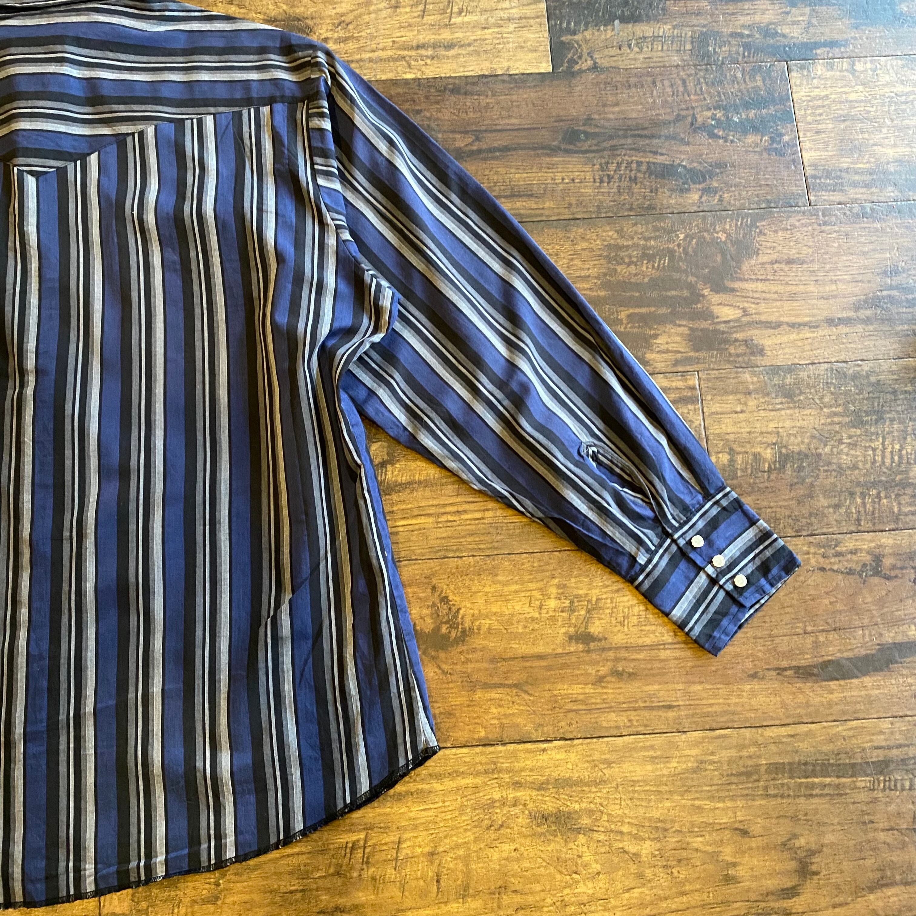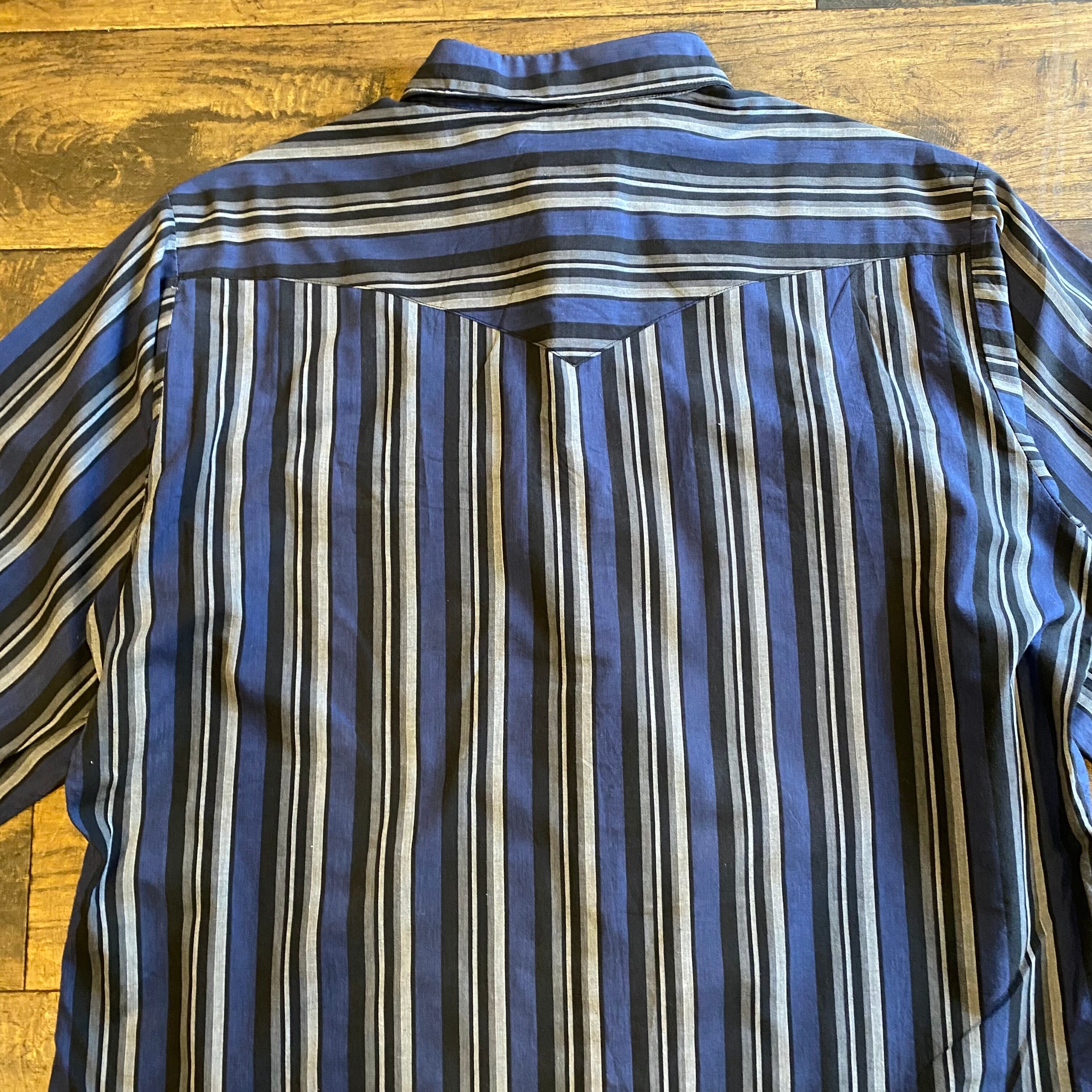 ブルー・ネイビー・グレーを基調とした縦ストライプ柄で、当時らしい配色とウエスタンディテールが特徴の一着です。