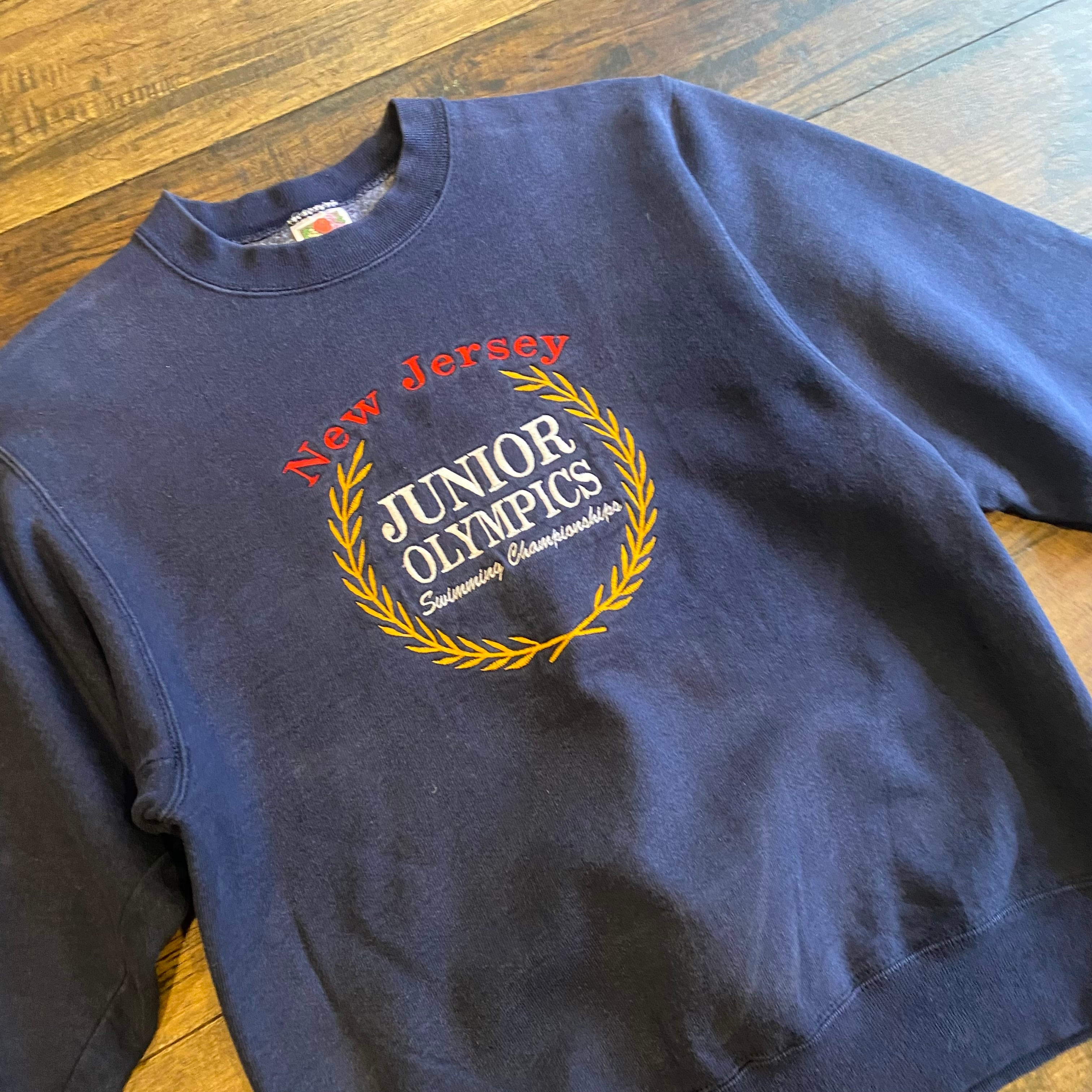 【USA製】90s Fruit of the Loom “New Jersey JUNIOR OLYMPICS” プリント スウェット ネイビー Size S