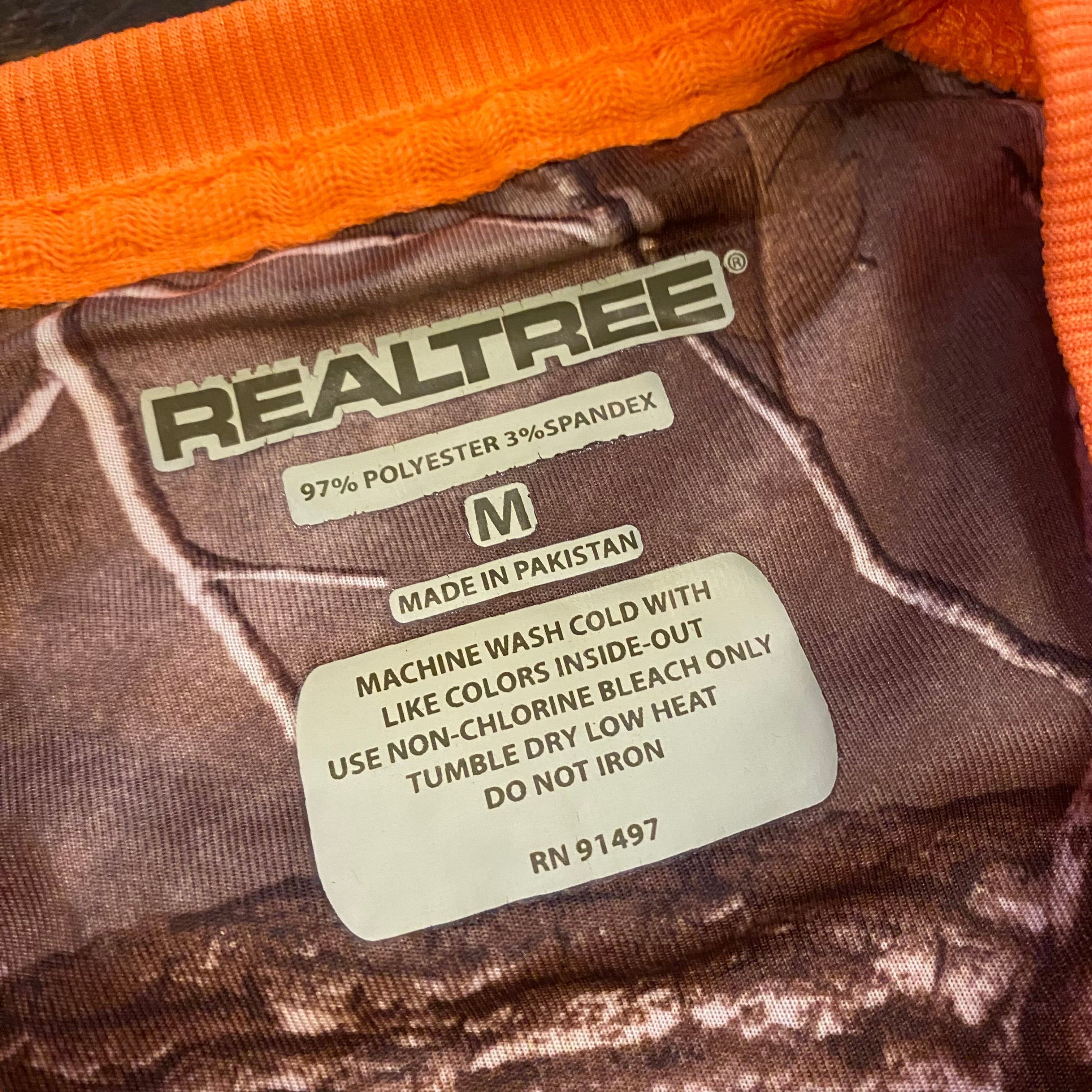 視認性の高いハンティングオレンジカラーに、胸元にはRealtreeのロゴ刺繍。ラグランスリーブ仕様で肩周りの動きやすさも考えられたデザインになっています。