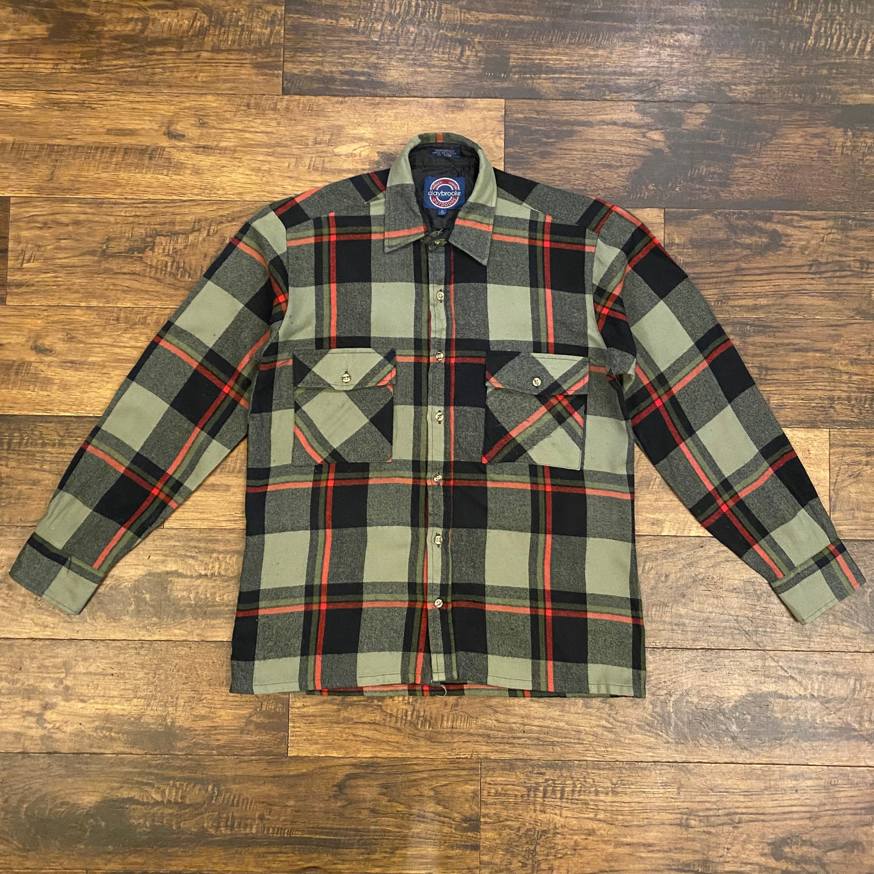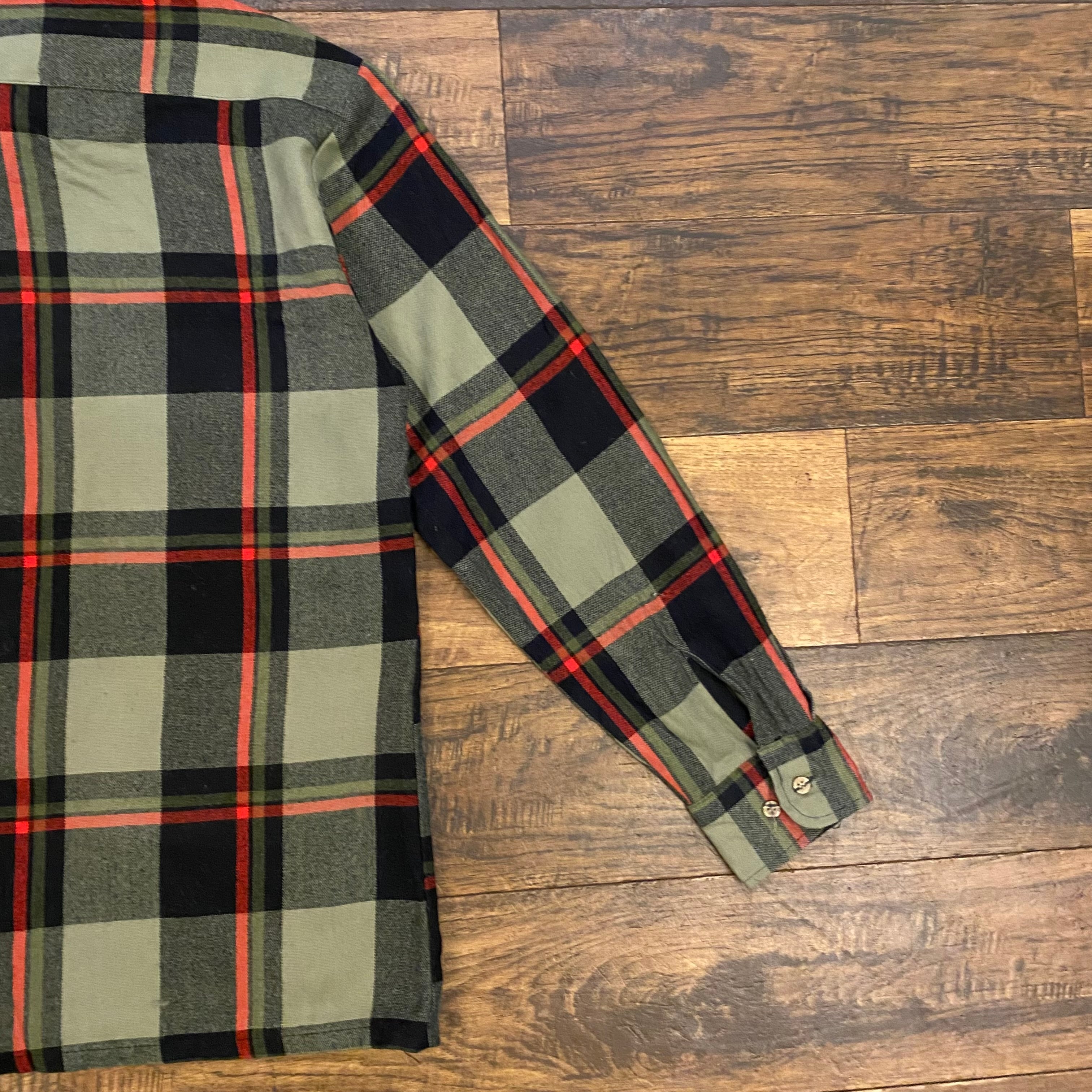 オリーブグリーン×ブラックをベースに、レッドラインが入るクラシックなアウトドアチェックが特徴の一着。90年代のアメリカアウトドアブランドらしい配色で、L.L.BeanやWoolrichなどにも見られるヘリテージ系のデザインです。