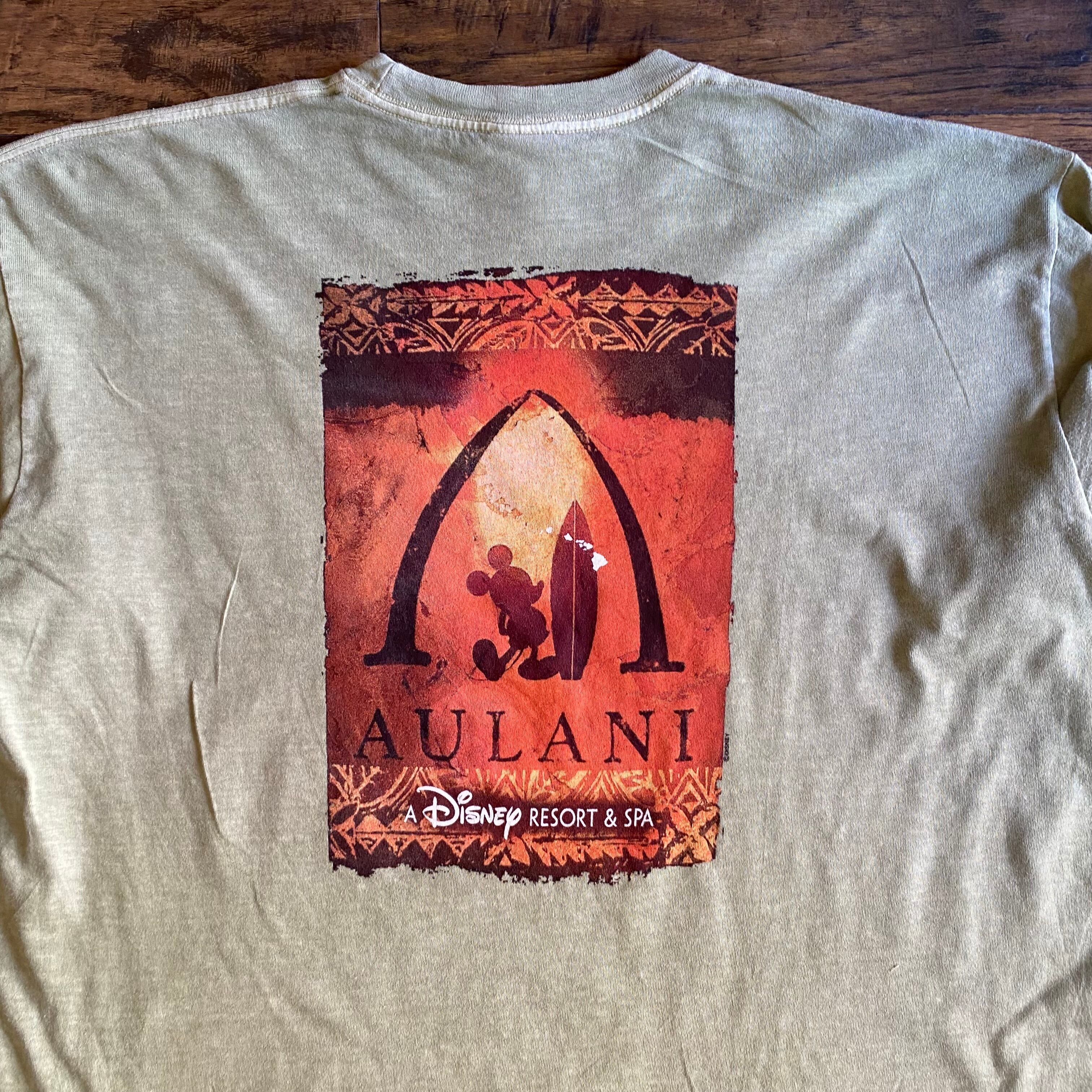 ハワイ・オアフ島にあるディズニー公式リゾート「AULANI」のグラフィックが入る一着。バックにはミッキーマウスとサーフボード、アーチ状のモチーフを組み合わせたデザインが大きくプリントされており、ハワイのリゾート文化とディズニーの世界観を融合させたデザインになっています。