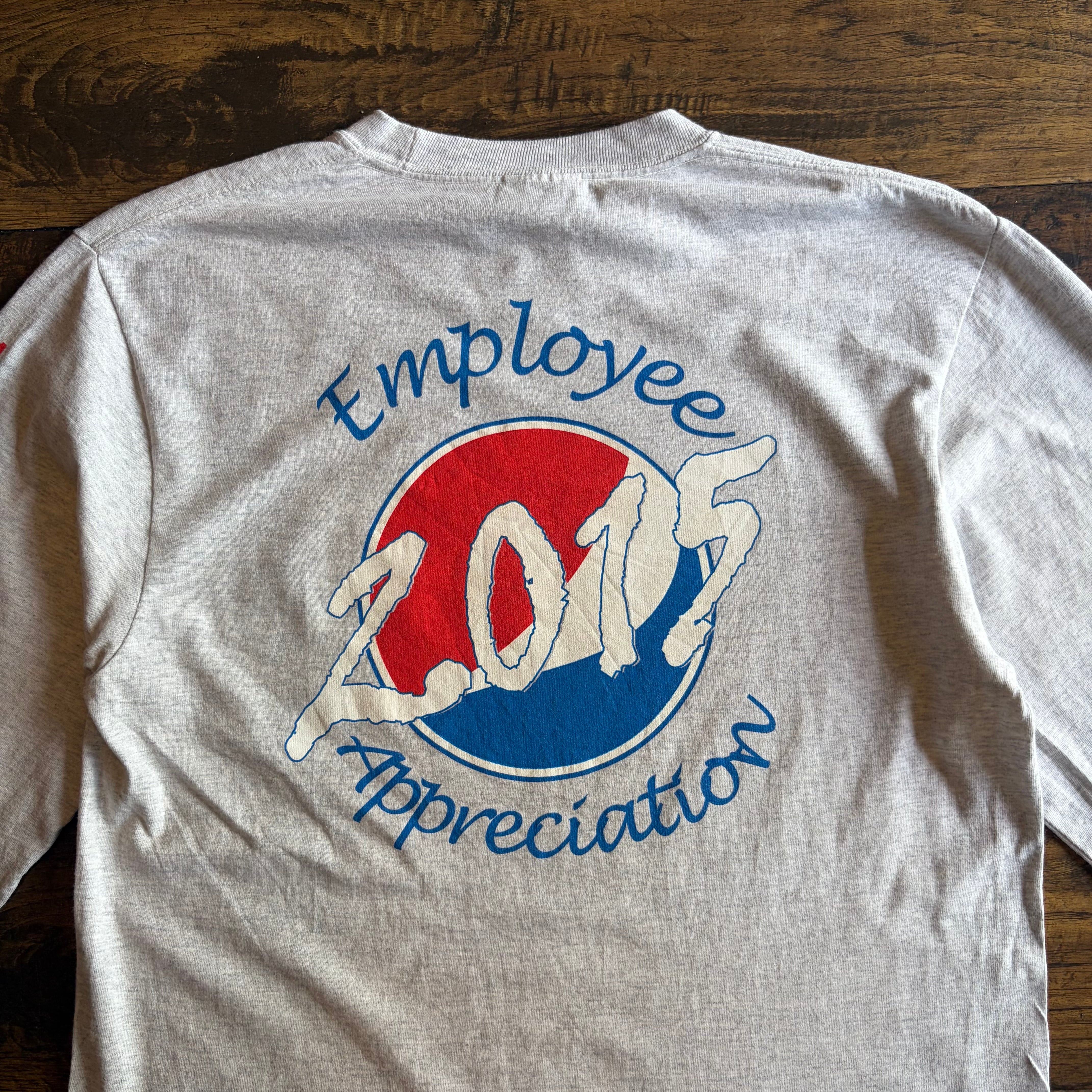 フロントは胸元にワンポイントでpepsi spireロゴ、バックには大きく「Employee 2015 Appreciation」プリントが入る一枚。さらに両袖にもレターが入っており、企業系らしい配色とバランスの良いデザインが魅力です。