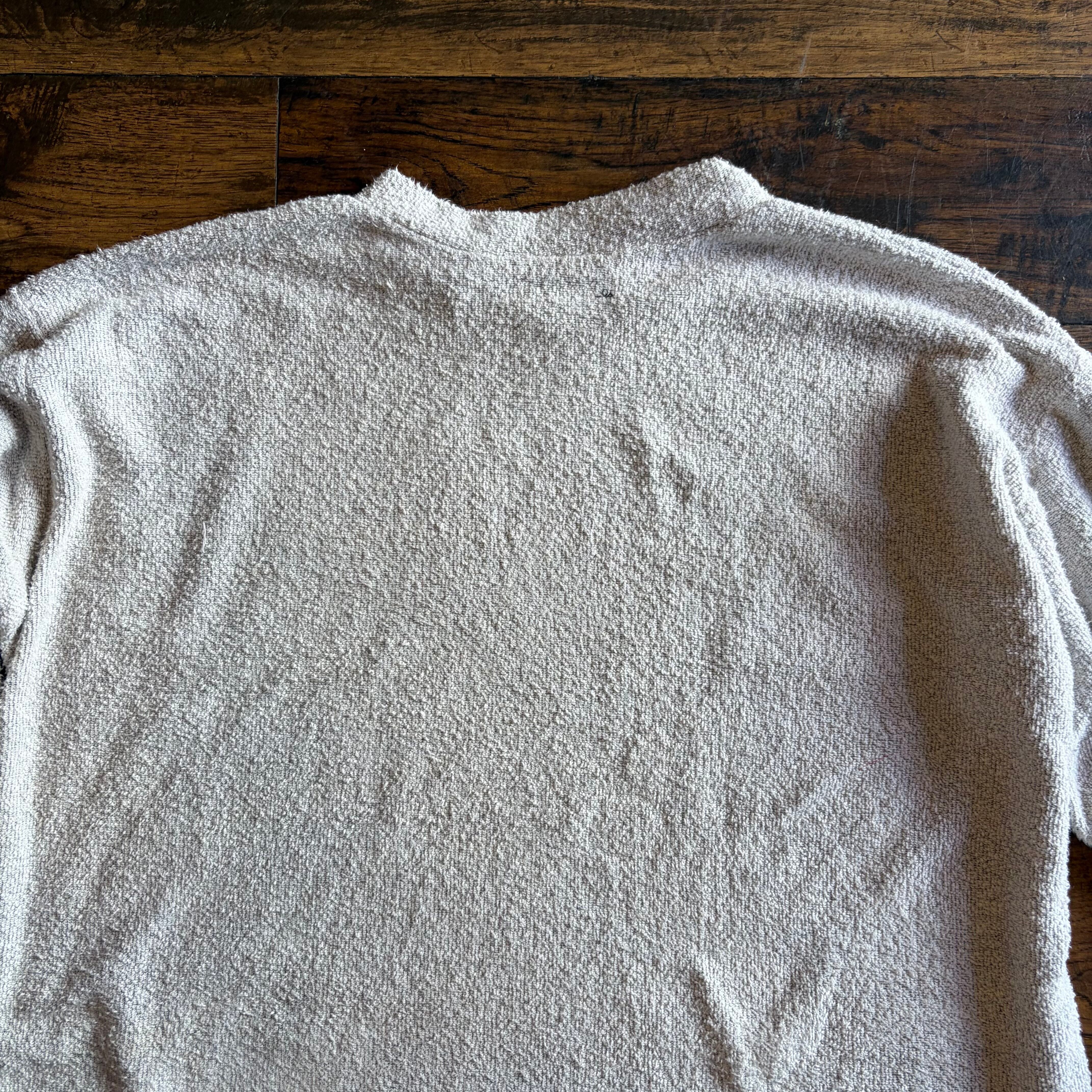 ボディは珍しいパイル(タオル地)素材で、柔らかく軽い着心地。一般的なスウェットとは違い、リラックス感のある表情が特徴です。生成りカラーに赤の刺繍が映え、ナチュラルかつ雰囲気のある仕上がり。