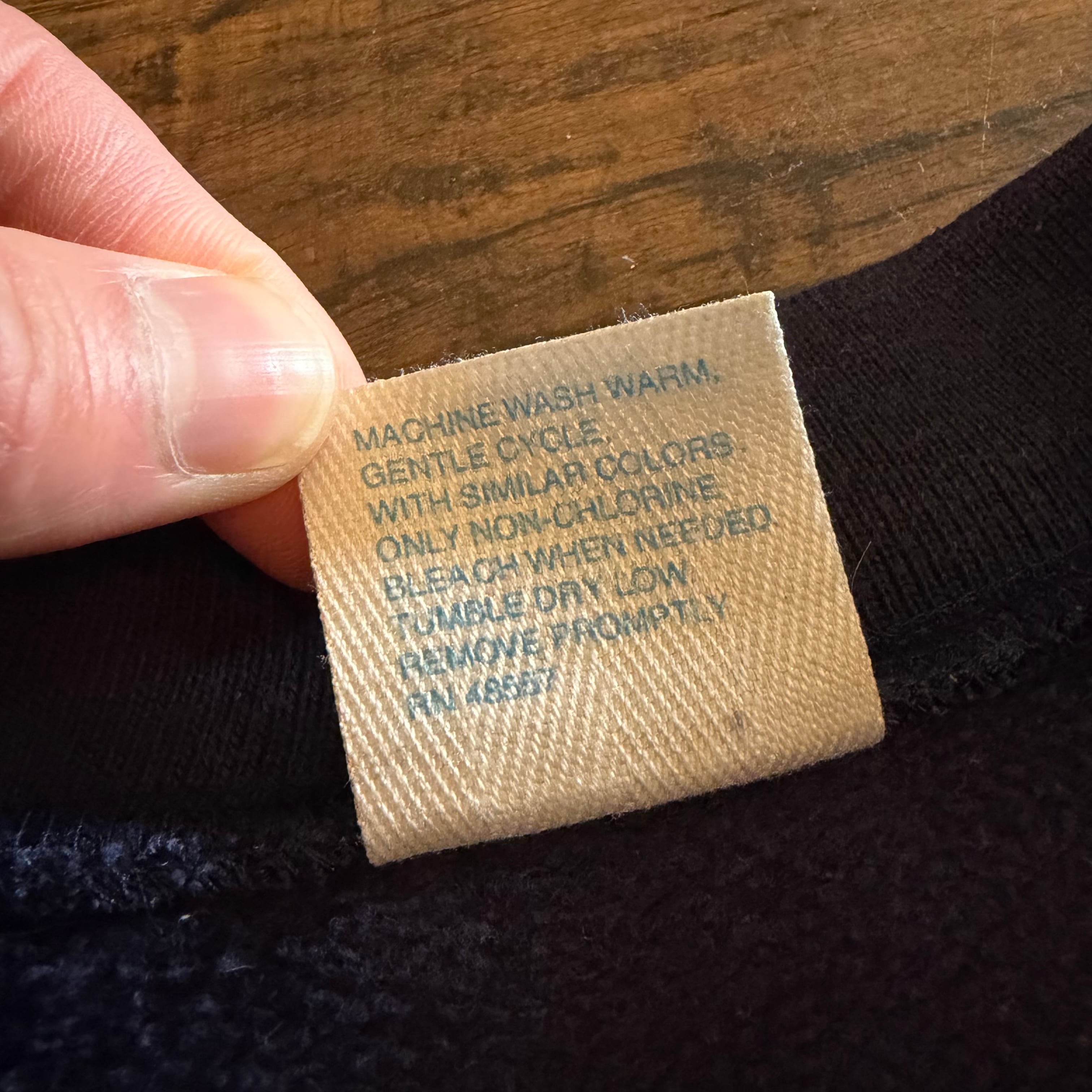 「MADE IN U.S.A. OF IMPORTED FABRIC」表記から、縫製はアメリカで行われている個体です。90年代以降のコスト構造の中で見られる生産背景で、USA製の中でもこの表記は当時らしい特徴の一つです。