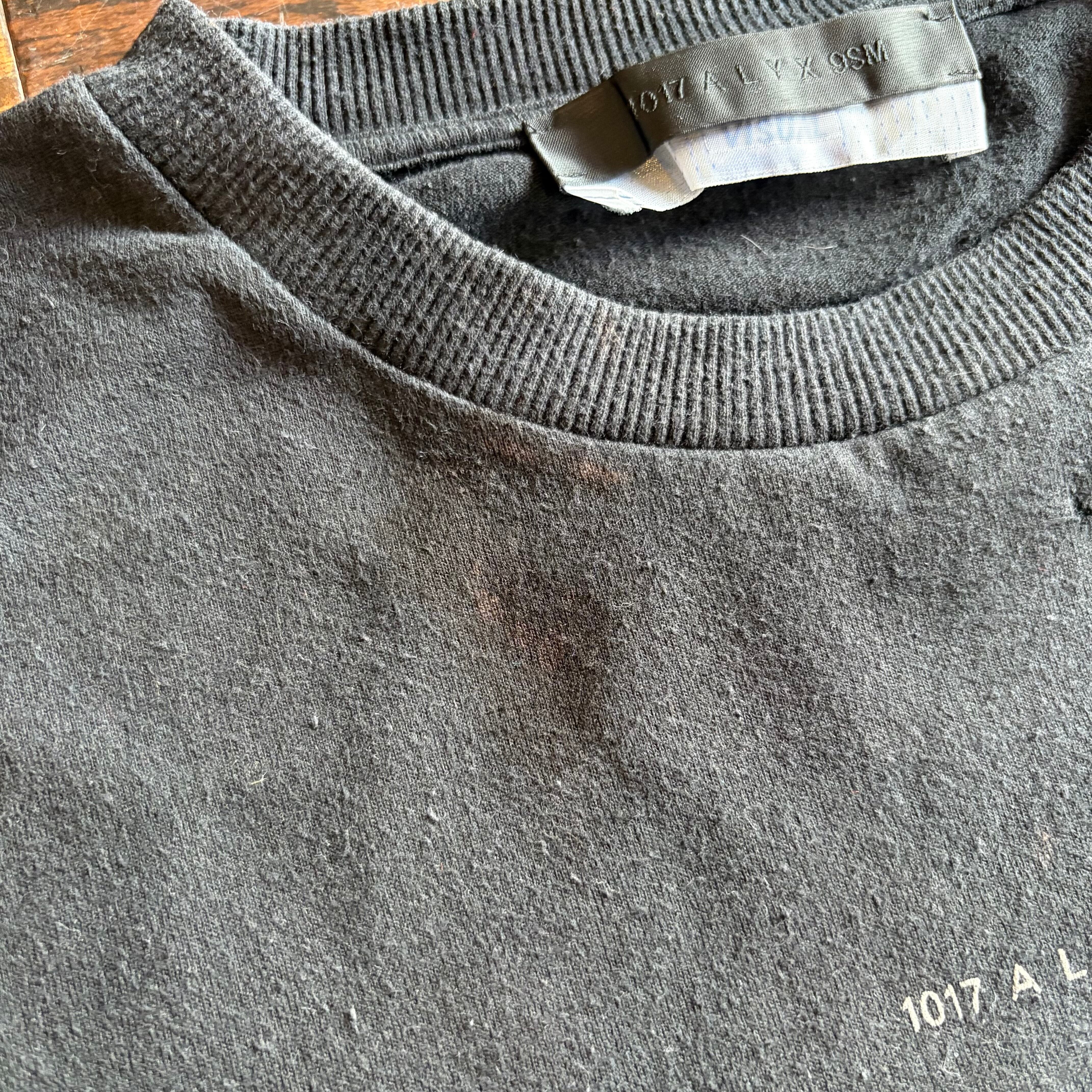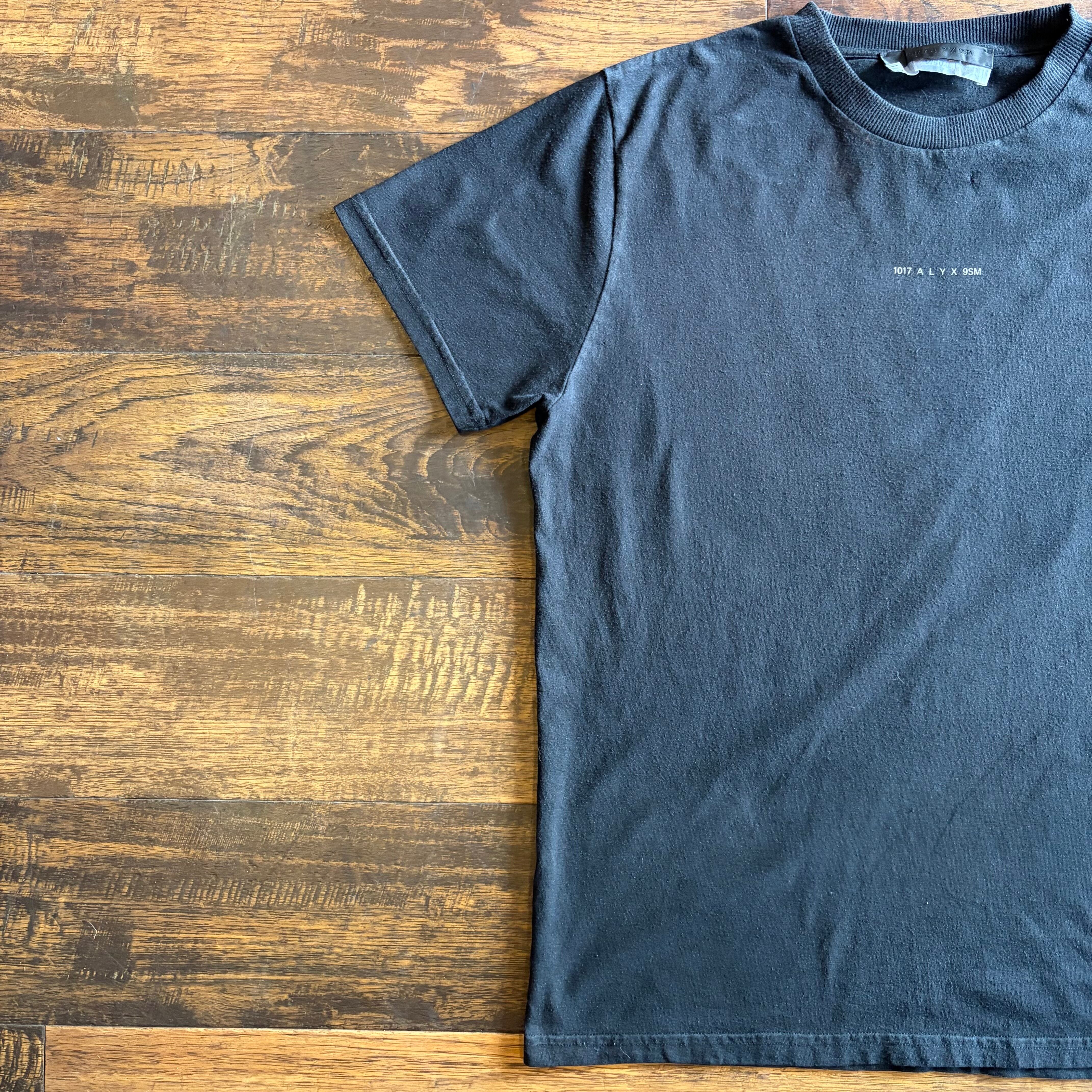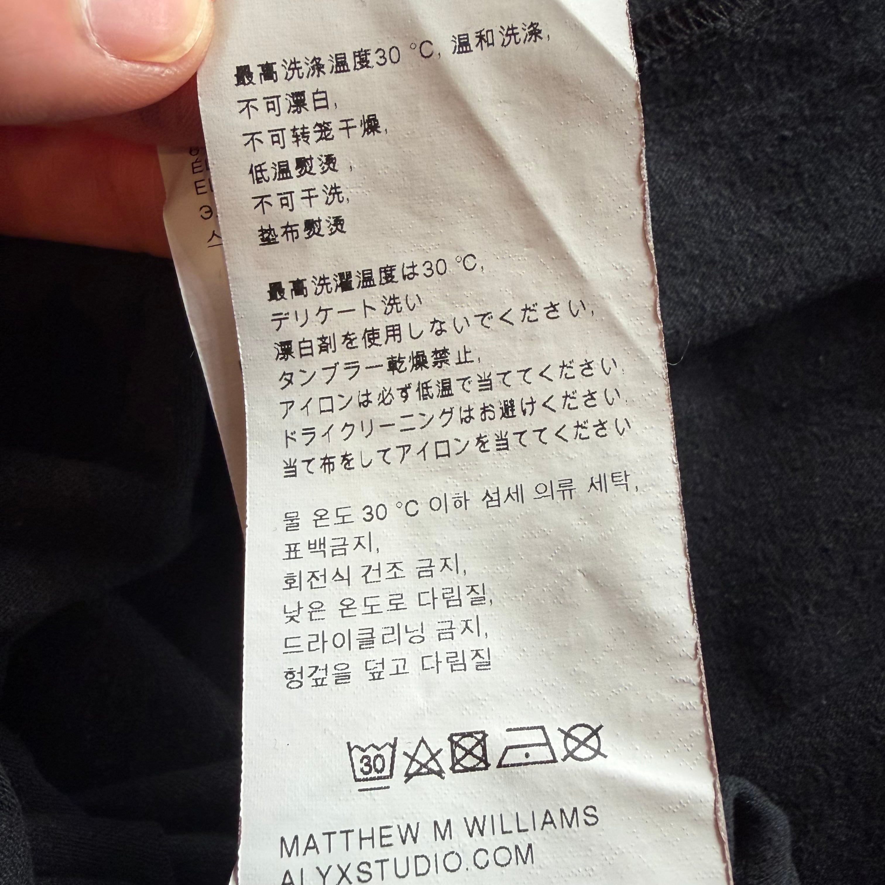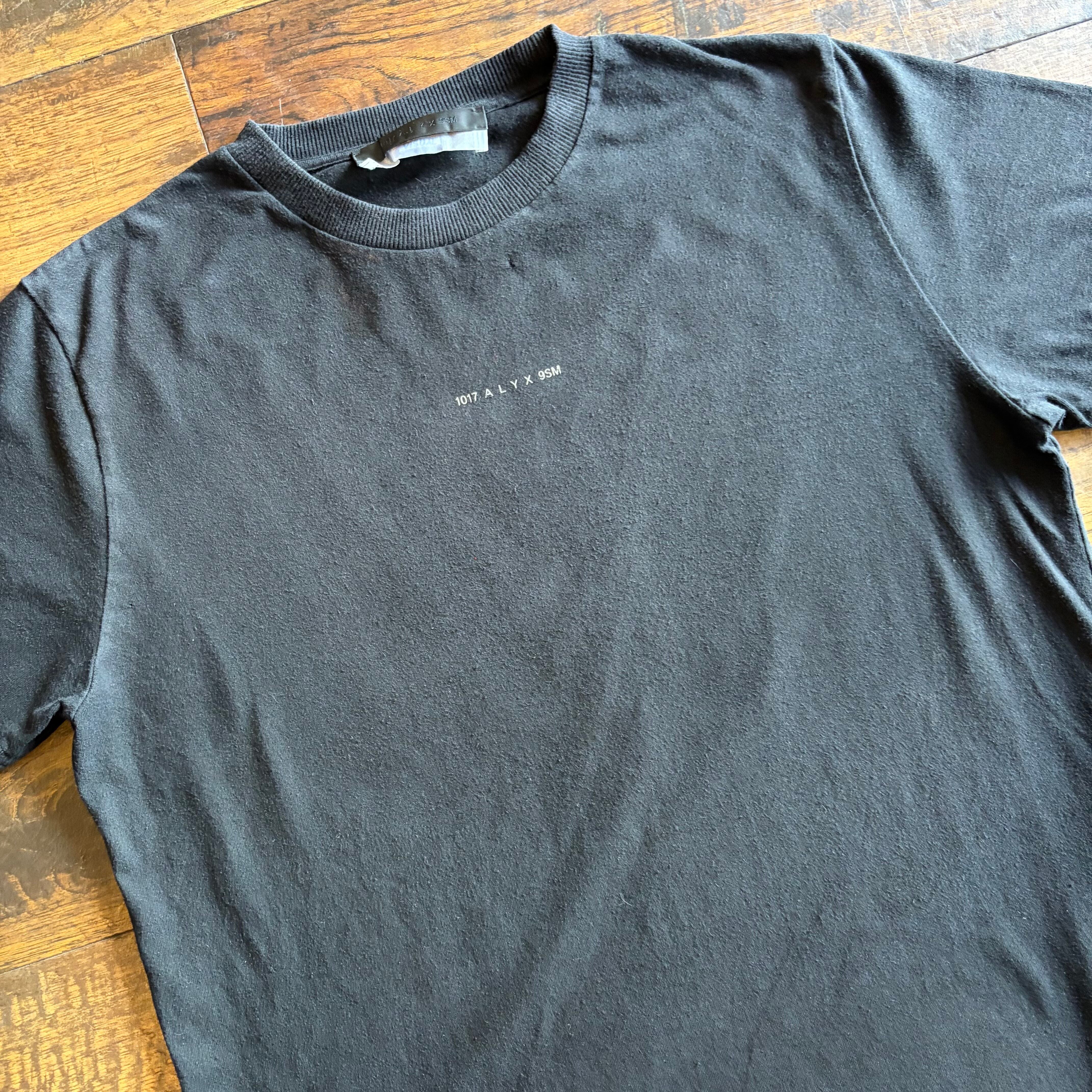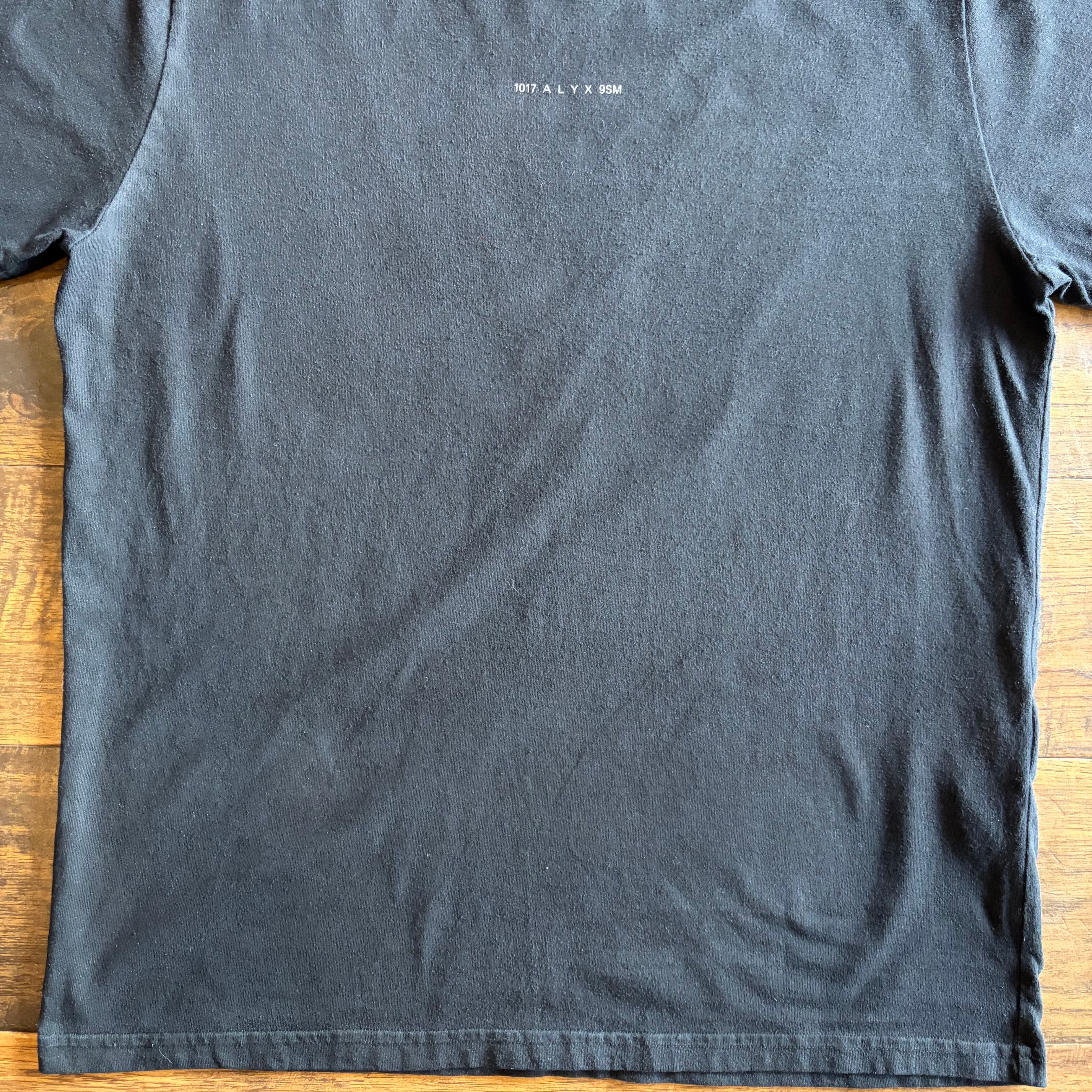 1017 ALYX 9SMは、Matthew M. Williamsが手がけるラグジュアリーストリートブランドで、機能性や工業製品的な美しさをファッションへ落とし込んだデザインが特徴です。この個体も、派手な装飾ではなく文字情報そのものをデザインとして成立させた一枚で、都市的でモードなスタイリングに馴染む仕上がりです。
