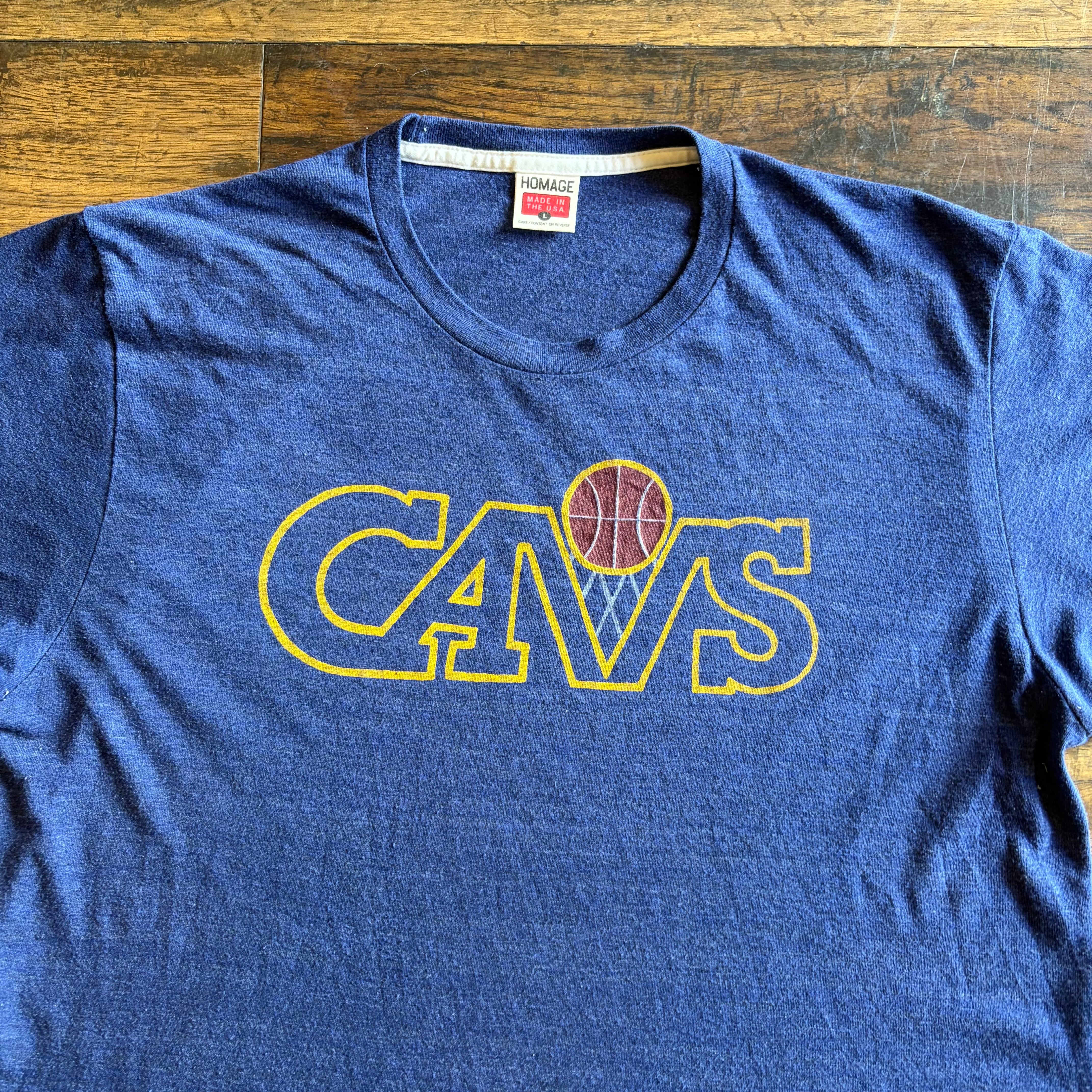 CAVSはNBAのCleveland Cavaliersを指す表記で、バスケットボールカルチャーをストレートに感じられるモチーフです。HOMAGEらしい柔らかい混紡ボディに、あえて少し着古したような雰囲気を持たせたプリントデザインで、ラフに一枚で着ても雰囲気の出る仕上がりです。シングルステッチ仕様なのもポイントです。