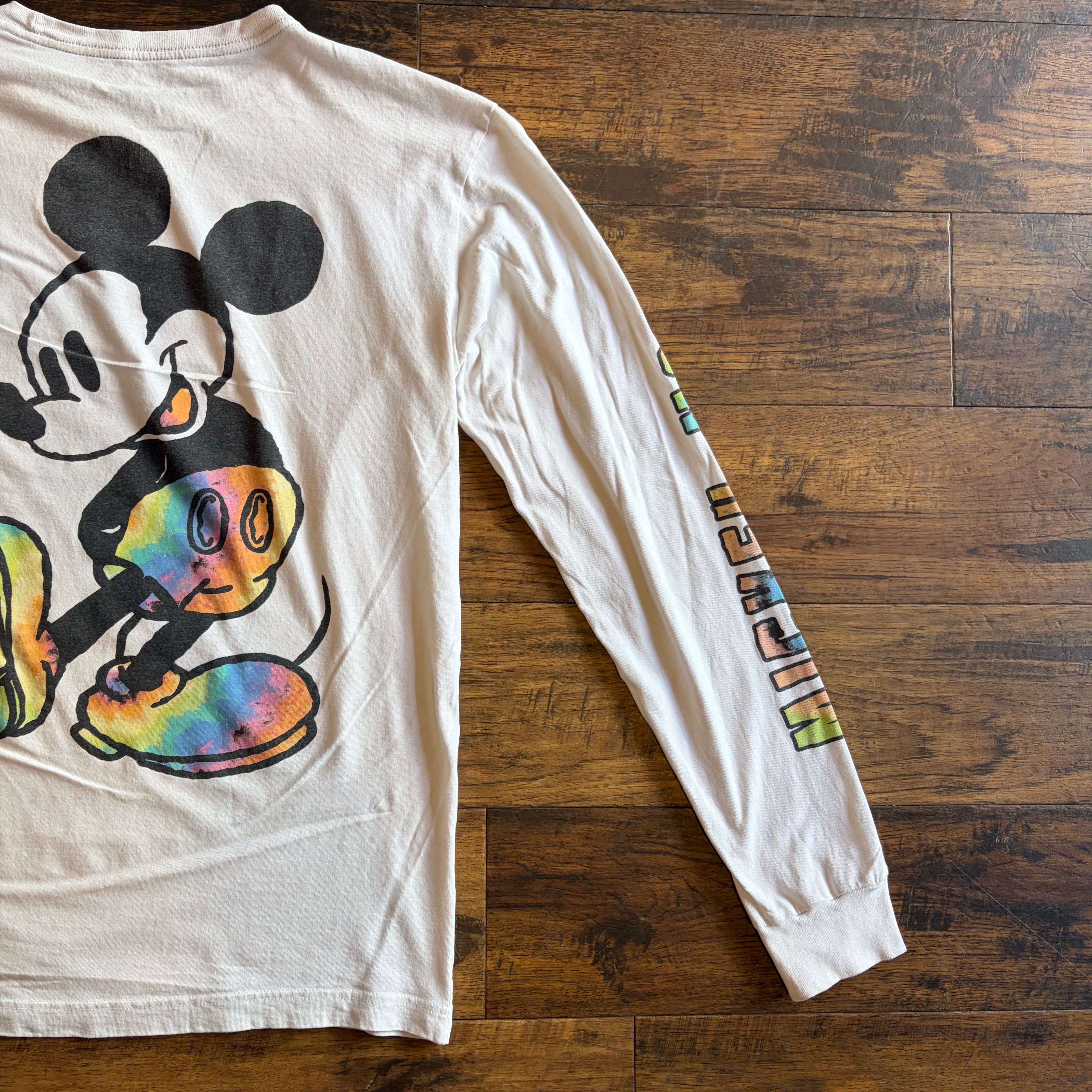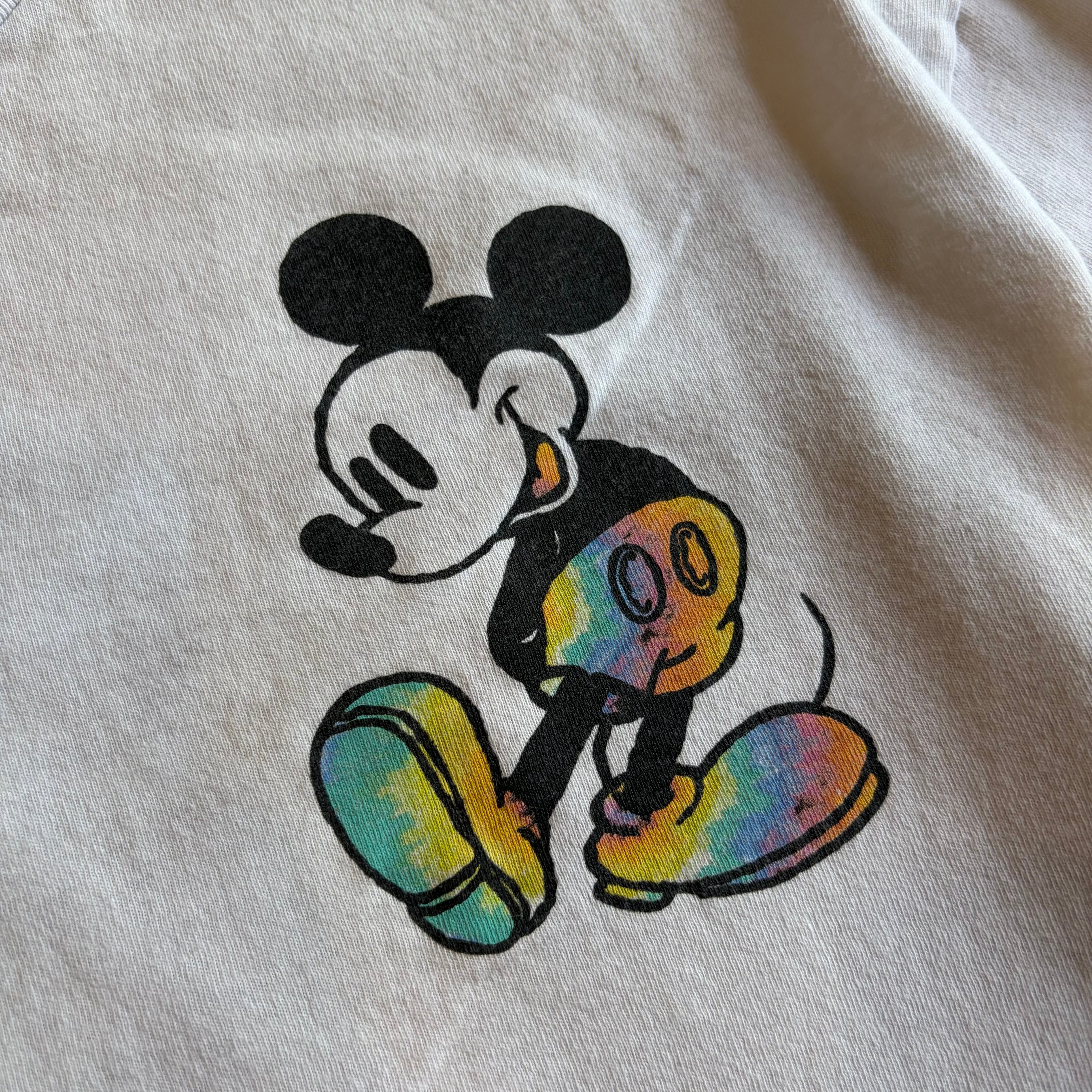 フロントはワンポイント、バックには大判のミッキーがプリントされたインパクトのある1枚。最大の特徴は、パンツやシューズ部分に入ったタイダイ調のレインボーカラー。クラシックなミッキーにストリート感のあるカラーリングを掛け合わせたデザインで、00年代らしいポップさと遊び心が強く出ています。