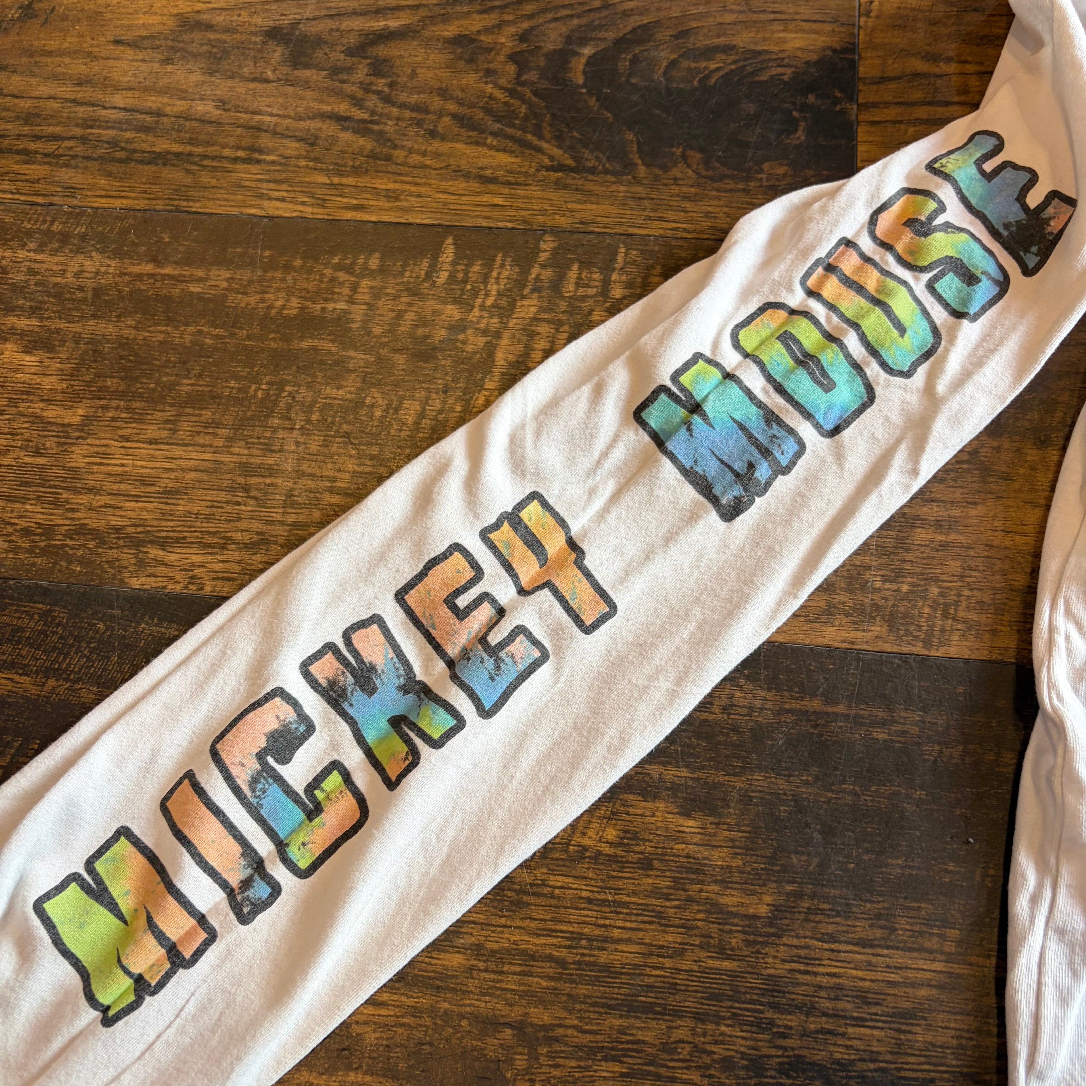 袖にも「MICKEY MOUSE」のプリントが入り、1枚でしっかり主役になる仕様。シンプルな白ボディに対して、プリントの色味がかなり映えるので、古着初心者でも着やすく、コーデのアクセントにも最適です。