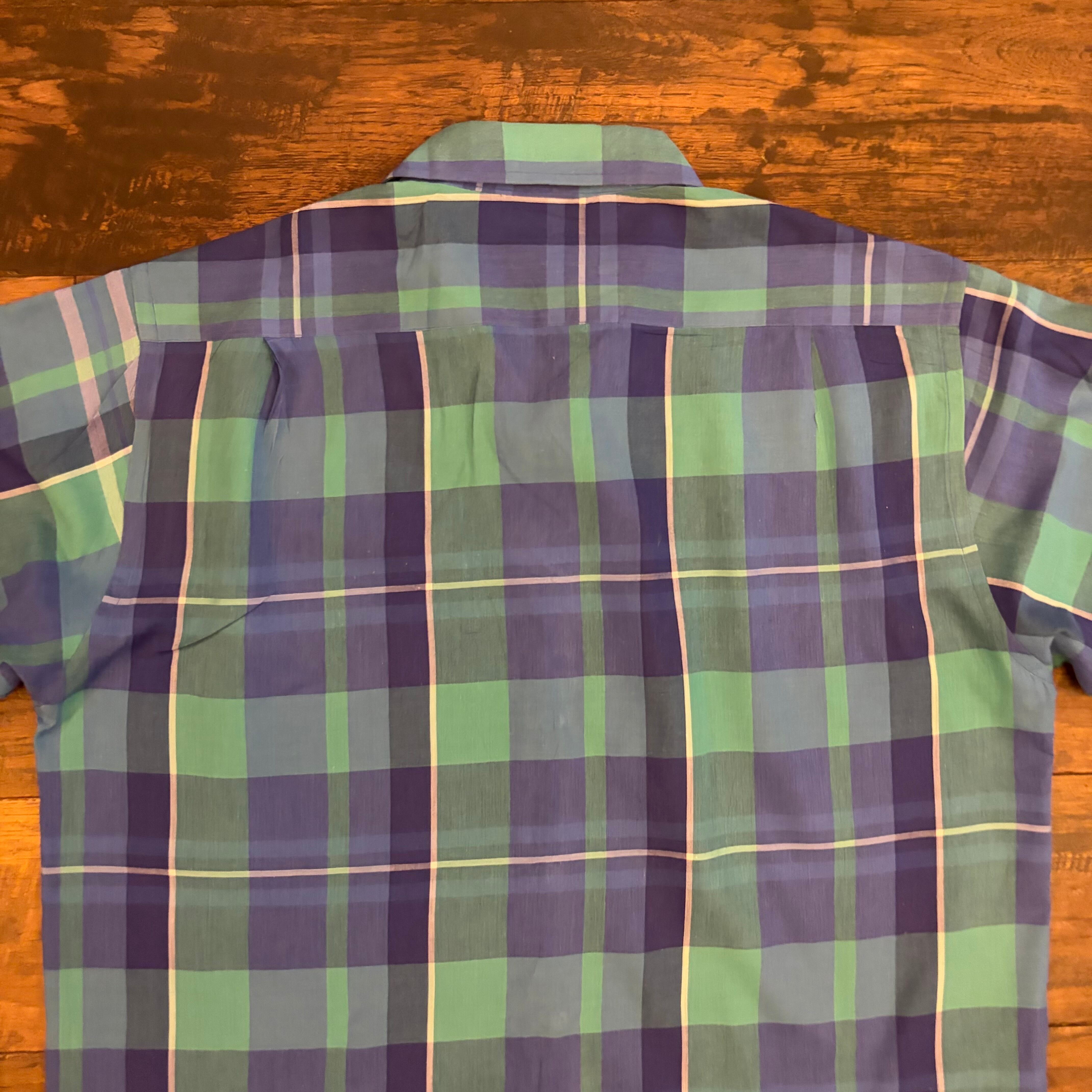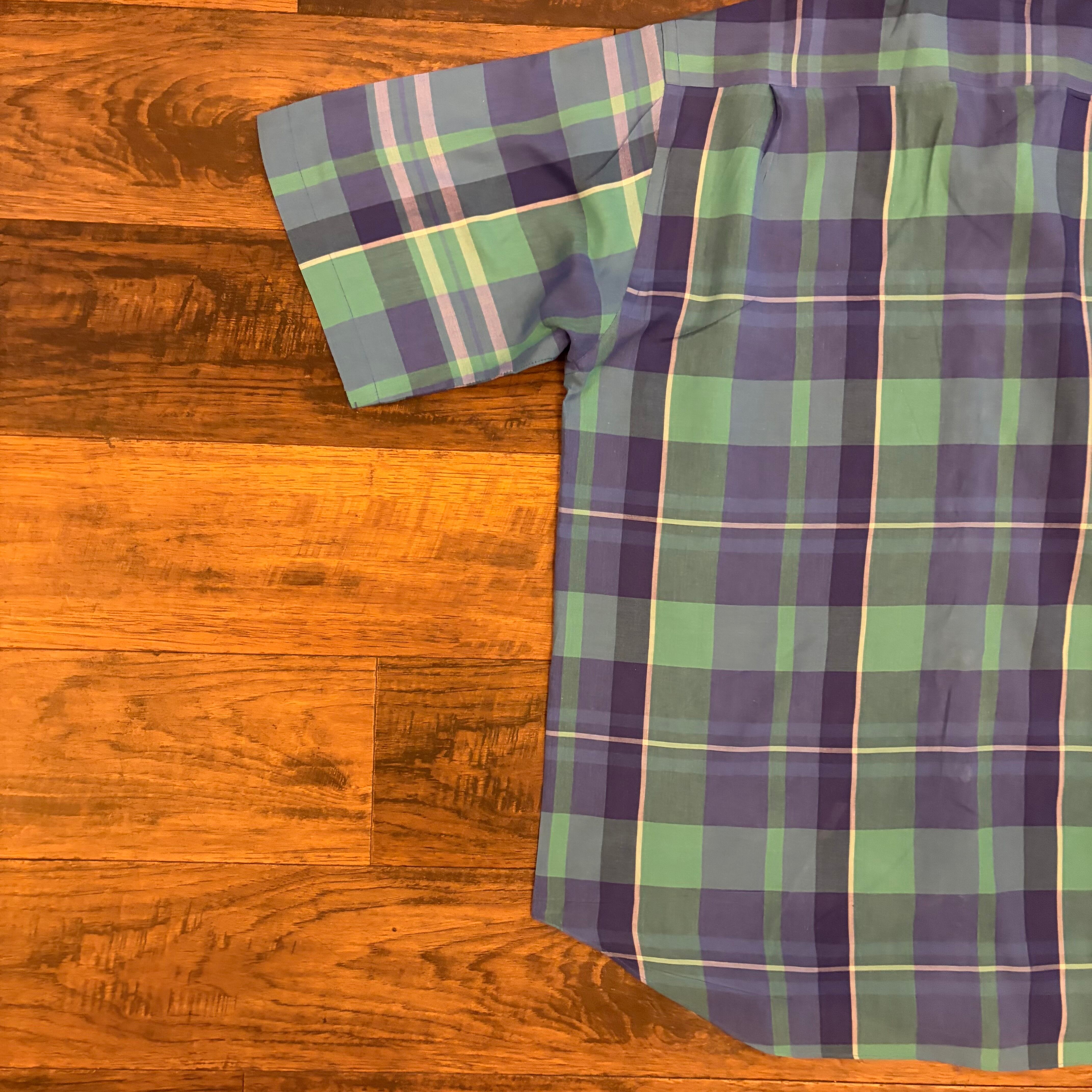 グリーン×ブルーをベースにした発色の良いチェックが特徴的な1着で、90年代らしいカラーリングと配色バランスがしっかり出ています。シンプルなボックス寄りシルエットに、ややゆったりしたサイズ感で、当時のカジュアルスタイルをそのまま体現したような雰囲気です。
