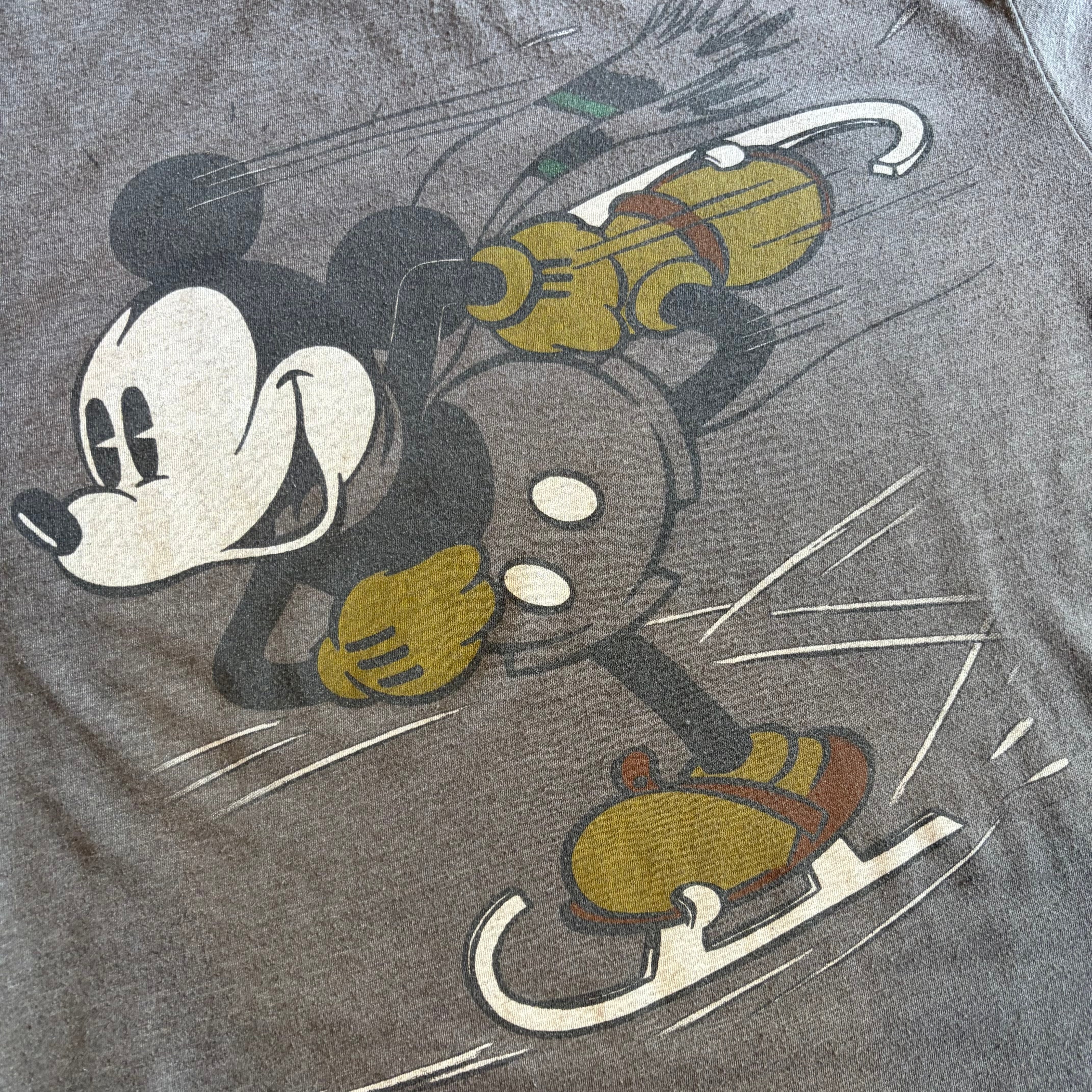 チャコールグレーのボディに、アイススケートを楽しむミッキーマウスが描かれた一枚。